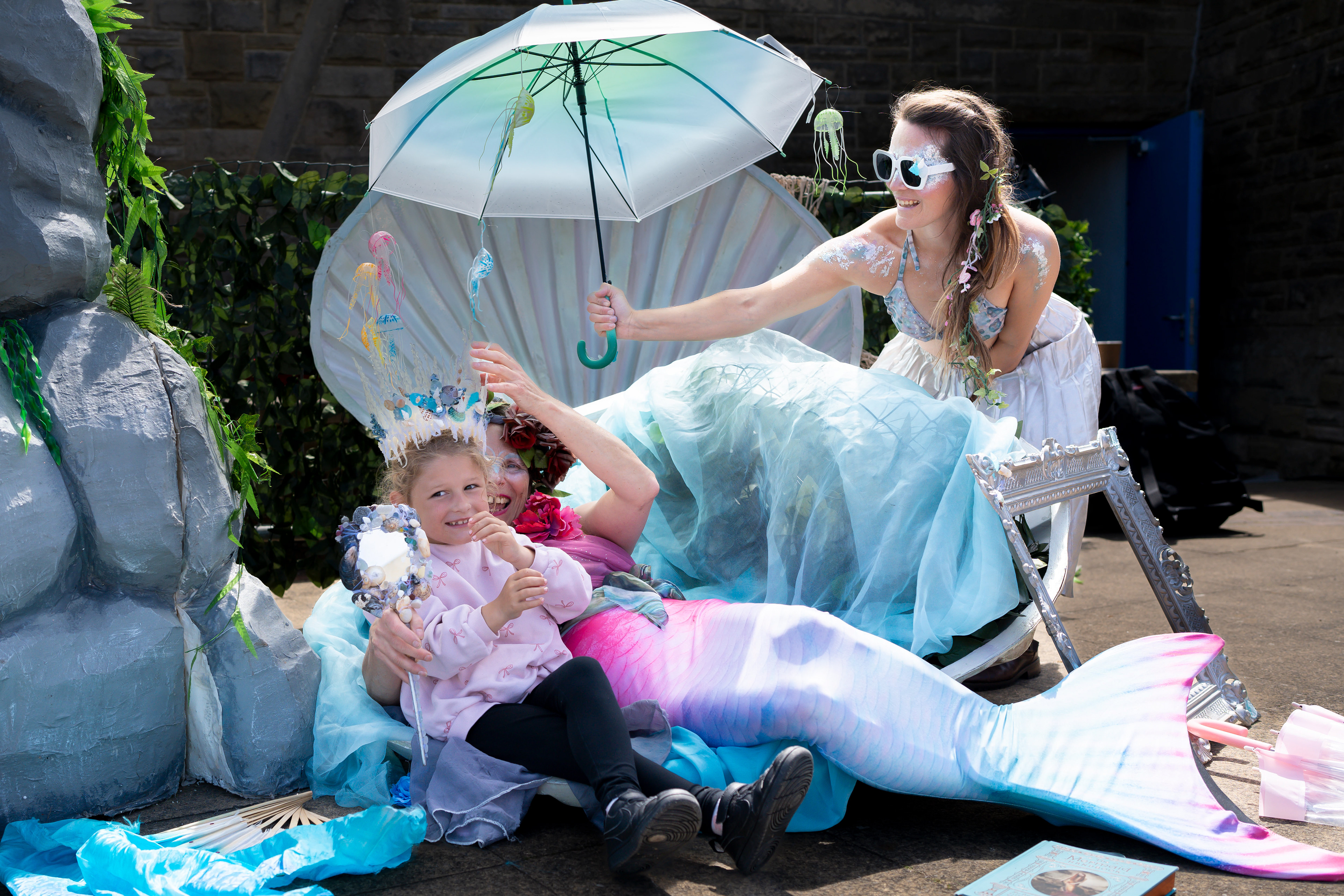Perfect for gardens, hired halls, or living rooms! Our mermaids arrive in full costume and create an enchanting under-the-sea atmosphere without the need for water. Expect: